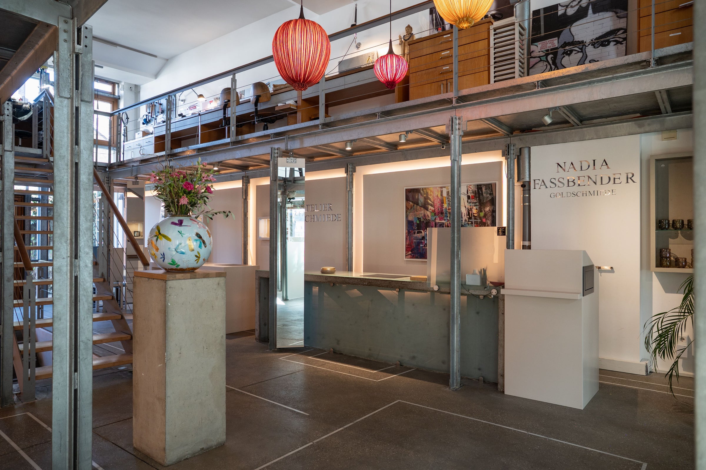Here, modernity meets history: behind the original façade of a house whose history dates back to the beginning of the 20th century, we welcome you to our modern, loft-like studio, where our business premises form the heart of our company: our goldsmith's workshop is located directly above the showroom on a gallery - a truly special feature that allows you not only to discover our high-quality jewellery during your visit, but also to experience how it is created by our master goldsmiths.